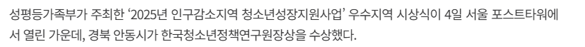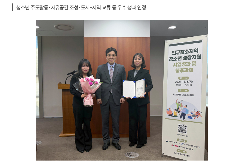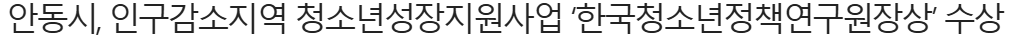 [신아일보] 안동시, 인구감소지역 청소년성장지원사업 '한국청소년정책연구원장상' 페이지 정보 작성자 관리자 작성일2025.12.30 조회4회 댓글0건 본문 출처:안동시, 인구감소지역 청소년성장지원사업 ‘한국청소년정책연구원장상’ 수상 - 신아일보 댓글목록 등록된 댓글이 없습니다. 이전글 다음글 목록